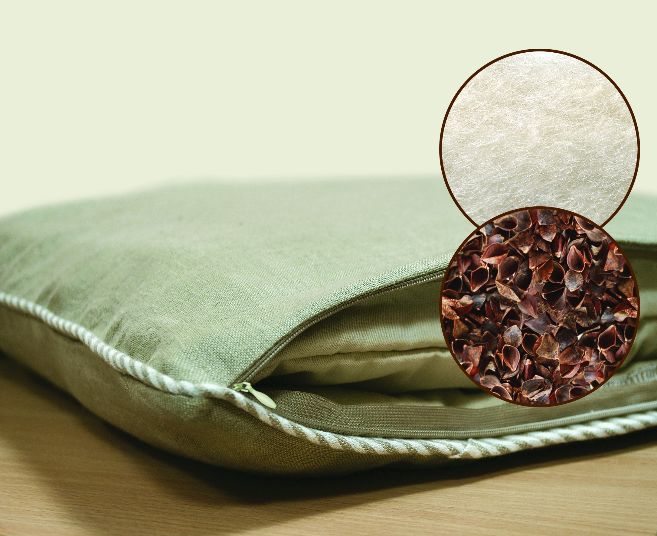 Pagalvė dvisluoksnė: vienas sluoksnis – minkštas, 100% lietuviškos avies vilnos užpildas, kitas - grikių lukštų užpildas.